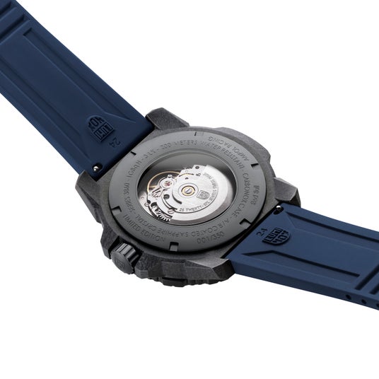今回のモデルは、ルミノックスの強靭性、自己発光システムによる視認性、防水性に加え、曜日と日付のウィンドウを備えた自動巻きムーブメントを搭載。ムーブメント等をスケルトンのサファイアクリスタルの裏蓋を通して見ることができます。