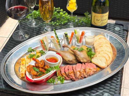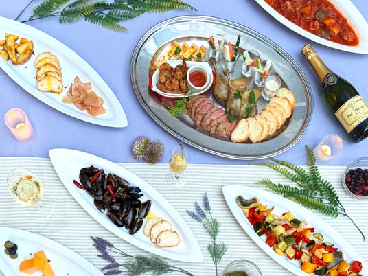 料理は、北海道産牛フィレ肉のローストビーフや鴨肉のコンフィなどを贅沢に盛り合わせた【お肉プレート】と、ラタトゥイユ、エスカベッシュ、ムールフリットなどを取り揃えた【プロヴァンス風オードブルビュッフェ】をご用意。