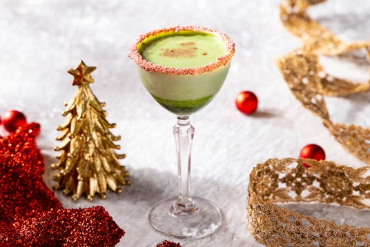お飲み物について、コーヒーや紅茶フリーフローの他、お一人様につき1杯、クリスマスカクテルをご提供いたします。ノンアルコールもしくはアルコールが選べます。ノンアルコールについては、クリスマスツリーに見立てたアイス抹茶ラテをベースに、ベリーのパウダーをふりかけた一杯です。アルコールについては、同じくアイス抹茶ラテをベースに、ラム(バカルディホワイト)30ml入れてシェイクし、ベリーのパウダーをふりかけた一杯です。