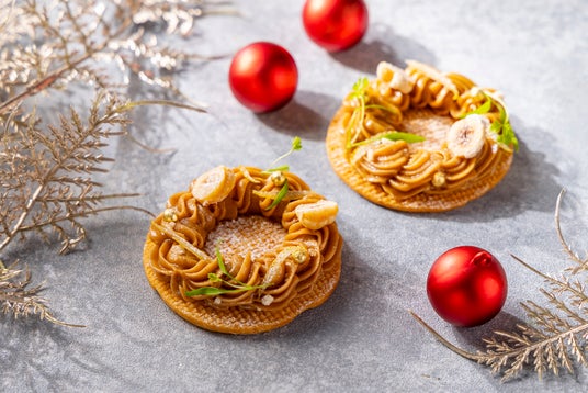 クロンヌプラリネクリスマスリースをモチーフに、リング状のサブレにヘーゼルナッツプラリネ入りのバタークリームを絞り、金色のアラザンとヘーゼルナッツで飾り付けしました。