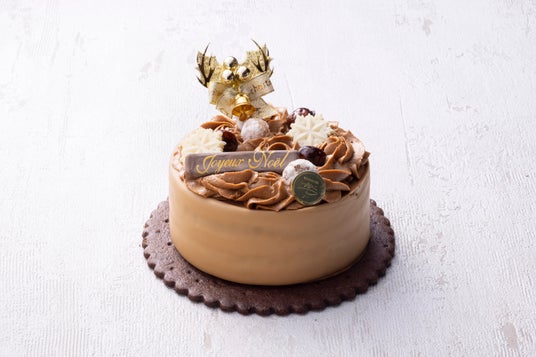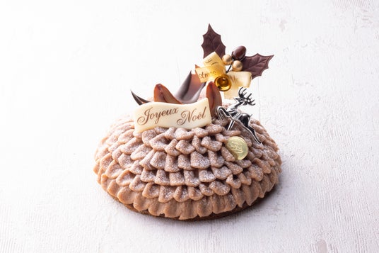 チョコレートクッキー生地にチョコレートスポンジとキャラメルムースを重ね、キャラメルチョコレートで包みました。キャラメリゼ、シュガーコーティングをした2つのフレーバーのマカダミアナッツと雪の形のチョコレートで華やかさを演出しました。