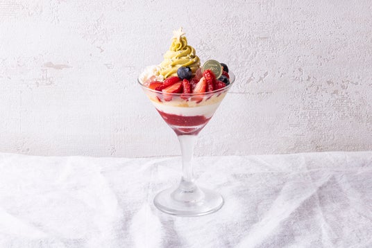 バニラアイス、フロマージュブラン、フランボワーズのジュレ、クランブルを苺のソースと絡めながら、フレッシュな苺、フランボワーズ、ブルーベリーと一緒にお召し上がりください。