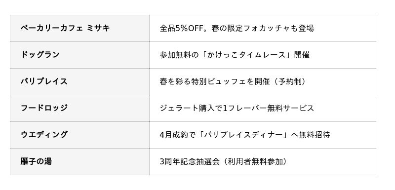 期間中は、各施設で記念企画や春限定サービスも実施します。