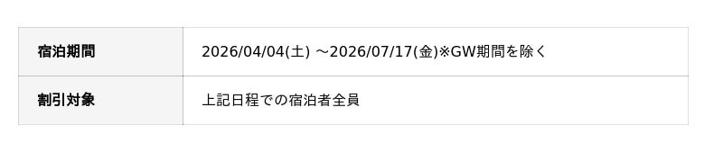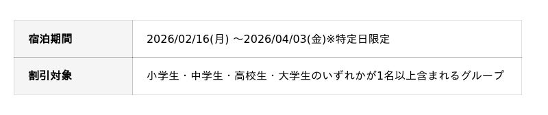 GW期間を除く土日も対象の期間限定セール。家族旅行やカップル旅行にも利用しやすい内容です。