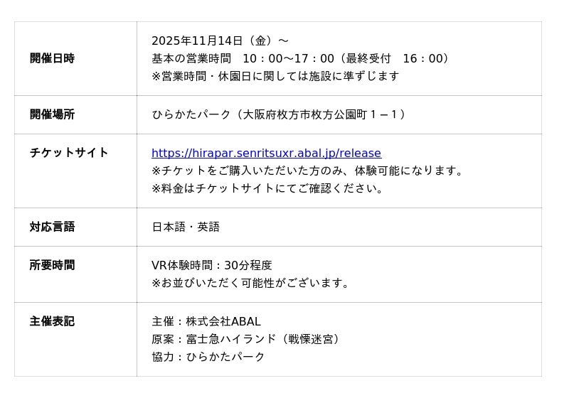 株式会社ABAL(所在地:東京都目黒区、代表取締役・CEO:尾小山 良哉、以下「ABAL」)は、富士急行株式会社(所在地:山梨県富士吉田市、代表取締役社長:堀内光一郎)とタッグを組み、富士急ハイランドが運営するホラー施設「戦慄迷宮」を原案とした、XR(拡張現実)技術を用いた新作VRホラーアトラクション『戦慄迷宮:迷』を2025年7月19日から44日間の期間限定で東京タワーで開催し、2万人以上の方にお越しいただき、大好評の中終了いたしました。