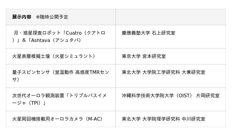 探査ロボット(ローバ)や火星の砂(シミュラント)など、実際に火星へ行くことを目指して開発されている「本物」のテクノロジーを展示予定です。日本の各大学で最先端の研究が進められており、研究者たちの情熱や火星探査の最前線を体感いただけます。 展示は順次公開予定致します。