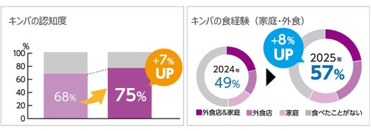 キンパの認知度は75%(前年より+7%食経験は外食店を中心に上昇し57%(前年より+8%)と上昇しており、キンパの食経験がある方のうち84%は「家庭でもキンパを食べたい」と回答しています(当社調べ 25年N=300)。