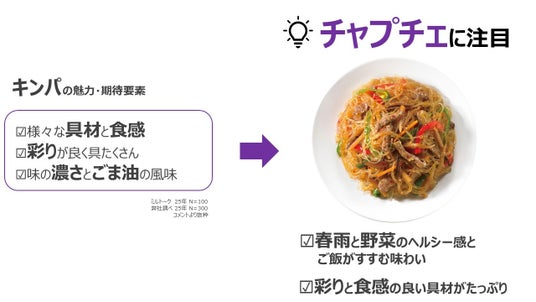 それぞれの食材に下味をつける調理法やごま油を使用する料理という点も含め、チャプチェはキンパの魅力をさらに引き出せるメニューであり、ご飯との相性も良いと考えました。