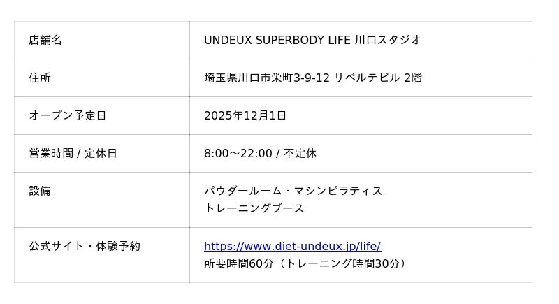 「UNDEUX SUPERBODY LIFE」(アンドゥスーパーボディライフ)は、株式会社フィットクルー(本社:大阪市西区、代表取締役:鹿島紘樹)が展開する女性専用の月額制パーソナルジムです。2025年12月1日に川口市に川口スタジオをオープンいたします。