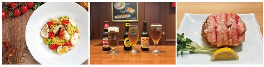 (左)牡蠣とタコ、夏野菜のペペロンチーノパスタ~タイムの香り~/ 9F 8THSEA OYSTER Bar(中)スペインビール各種/ 9F EX Yokohama(右)毛ガニ/ 8F 江戸前寿司 築地 寿司清