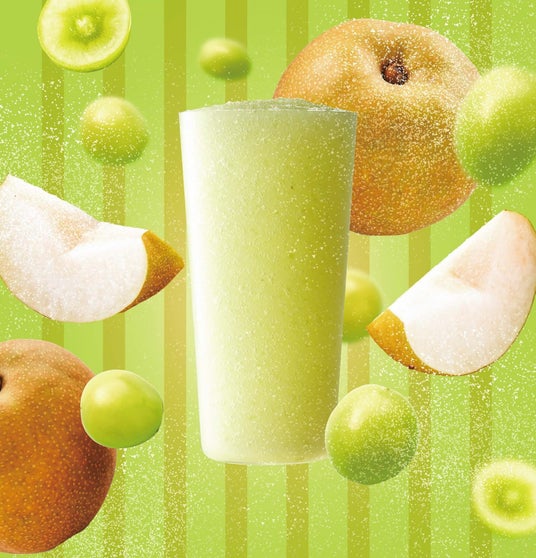 “梨”と組み合わせた『シャインマスカットと梨ジュース』は、シャインマスカットジュースに梨特有のシャリシャリとした舌ざわりとみずみずしさが加わった、飲みごたえのあるジュースに仕上げています。秋の味覚を2種類同時に堪能できる嬉しい一杯です。