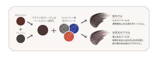 – さらに、3色のパール(シルバー・青・赤)をブレンドして高配合。大粒のパールが光を集めて上品なきらめきをもたらします。光の当たり方によって、「透明感あふれる深みグレージュ」から「抜け感のある温もりブラウン」に色彩が変化して見えることで、ニュアンスの異なる目もとを演出します。