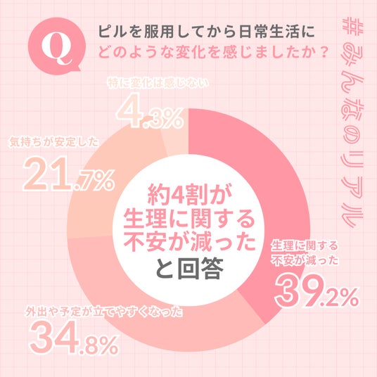 結果:「生理に関する不安が減った」39.2%、「外出や予定が立てやすくなった」34.8%、「気持ちが安定した」21.7%、「特に変化は感じない」4.3%