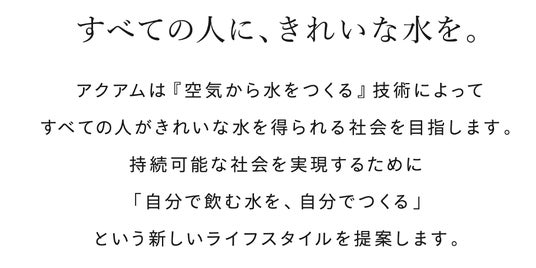 株式会社アクアムは、空気中に含まれる水分を吸着し濾過することにより「空気から水をつくる」空気製水機を開発・販売しています。独自の技術により、日本人の味覚に合わせた“美味しい水”を製水するAQシリーズには、1日製水量が20Lから1000Lのものまで、用途や場所に合わせた様々なサイズおよびデザインのモデルを開発・製造・販売しております。