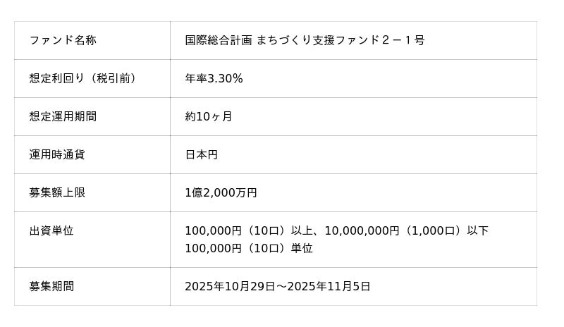 「未来をわかちあう投資」を提供する「Funvest(ファンベスト)」(以下、Funvest)は、「国際総合計画 まちづくり支援ファンド2-1号」(以下、本ファンド)の募集を10/29より開始しますので、お知らせいたします。