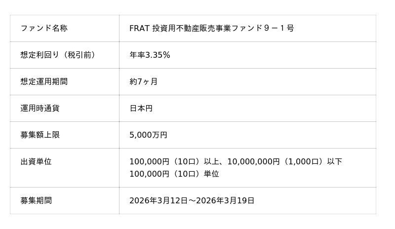 「未来をわかちあう投資」を提供する「Funvest(ファンベスト)」(以下、Funvest)は、「FRAT 投資用不動産販売事業ファンド9-1号」(以下、本ファンド)の募集を3/12より開始しますので、お知らせいたします。