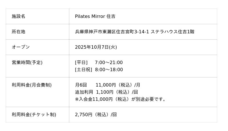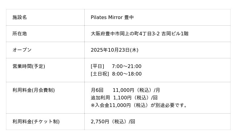 コナミスポーツ株式会社(以下、「弊社」)は、天井にミラーを設置したマシンピラティススタジオ「Pilates Mirror 長原(東京都大田区)」を2025年9月25日(木)、「Pilates Mirror 住吉(神戸市東灘区)」を2025年10月7日(火)、「Pilates Mirror 豊中(大阪府豊中市)」を2025年10月23日(木)にオープンします。