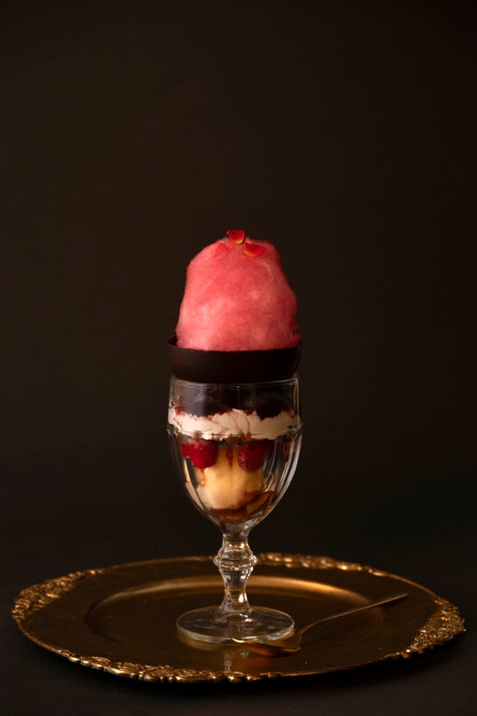 グラスの底にはグラハムクラッカー、その上にラズベリーソース、バニラアイスクリーム、ラズベリー、サブレ生地を重ね、温かいダークチェリーソースと、メレンゲを絞ったチョコレートのカップ、炎をイメージしたわたあめで仕上げました。サブレのサクサク感やメレンゲのふんわりとした食感のコントラストも魅力の一つ。混ぜ合わせれば、アイスクリームに香ばしいチョコレート、チェリーやラズ