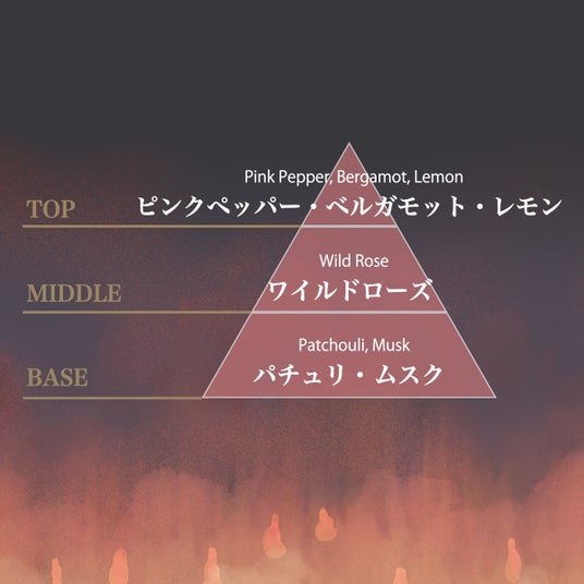 Heart of Flameの香り華やかに咲き誇るローズに、ピンクペッパーのスパイシーなアクセントを加え、大人の気品を感じさせる香り。