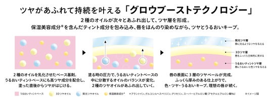 ◆この仕上がりを叶えるのが資生堂初の新技術「グロウブーストテクノロジー」です。ティント成分で唇をほんのり染めながら、2種のオイルがツヤの層を形成することで、ふっくらとした厚みのあるツヤとうるおいをキープします。※2。