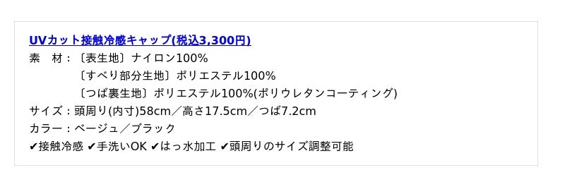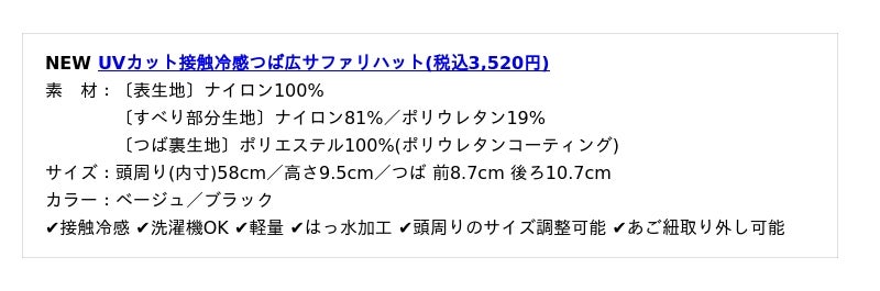 *1 つば部分のみ(UVカット接触冷感ネックシェードは裏面のみ)。JIS L 1925の規定に準じて生地のUVカット率100%の測定値が出た生地をUVカット率100%生地としております。JIS L 1055 A法にて遮光率100%の測定値が出た生地を遮光率100%生地としております。JIS L 1925の規定に準じて生地のUPF値を測定しています。※記載の結果は生地の状態での測定値であり、帽子本体の性能を示す数値ではございません。