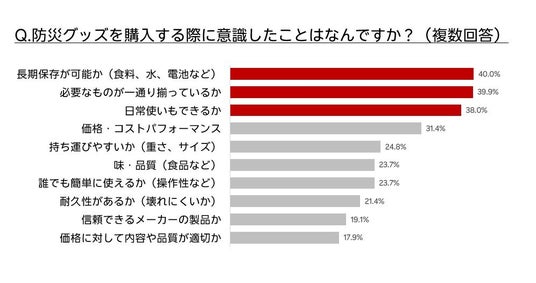 2024年以降に購入した防災グッズについて尋ねたところ、「水」「非常食」「モバイルバッテリー・乾電池」「マスク・ウェットティッシュ」「非常用トイレ」が上位に挙がりました(図2)。また購入時に意識することについては、価格やコストパフォーマンスよりも「長期保存が可能か(食料、水、電池など)」「必要なものが一通り揃っているか」「日常使いもできるか」という回答がトップ3となりました(図3)。このことから、消費者は防災グッズを購入する際に、実用性や網羅性を重視していることがうかがえます。
