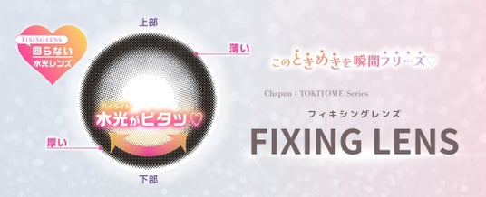 回らない特殊設計のレンズ「Fixing lens (フィキシングレンズ)※」を採用し、正しい位置にハイライトを固定することで、魔法で時が止まったようにピタっと可愛い瞳をキープできます。ハイライトが自然に下で固定される特殊設計で常に一定の位置をキープできるので、従来の水光レンズにありがちな「ハイライトが回ってちぐはぐに見えちゃう」お悩みを解決します。