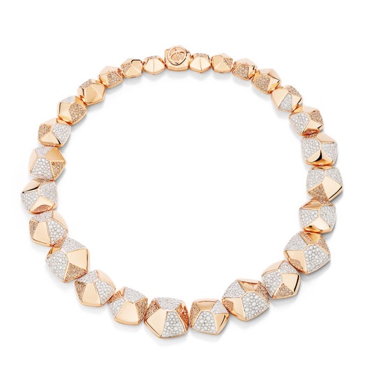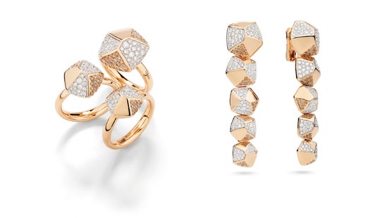 ポメラートのアトリエでは、一つひとつの「ペンタゴニ」ピースが卓越したクラフツマンシップにより丹念に生み出されていきます。熟練の職人が、それぞれのダイヤモンドを丁寧に配し、その配置ひとつでもデザイン全体の調和に影響することを心得た上で作業が進められています。デザインは、メゾンのシグネチャーであるイレギュラーなダイヤモンドパヴェ、ポリッシュされたローズゴールドの面を交互に組み合わせ、遊び心とセンシュアリティを感じさせる素材の対話を生み出しています。個々のストーンが思いがけない方向から光をとらえるこのセッティングにより、反射し、驚きと輝きに満ちた表情を見せるのです。