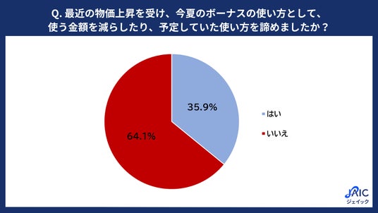「最近の物価上昇を受け、今夏のボーナスの使い方として、使う金額を減らしたり、予定していた使い方を諦めたりしましたか?(諦める予定ですか?)」と質問したところ、「はい」が35.9%、「いいえ」が64.1%となり、約4割弱の人が物価上昇の影響を受けてボーナスの使い方に変化があったことがわかりました。