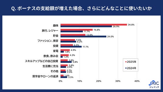 2024年調査と比較すると、「趣味」が18ポイント、「旅行、レジャー」が5.1ポイント増加した一方で、「貯金」が11ポイント、「投資」が4.6ポイント減少する結果となり、将来への備えよりも、自分の楽しみや体験にボーナスを使いたいという傾向の強まりが見受けられました。
