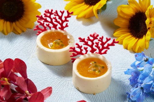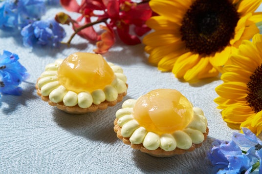 「桃とエルダーフラワーのタルト~ひまわり仕立て~」(※1)は、爽やかなエルダーフラワーのゼリーと、甘酸っぱい桃のコンビネーションが楽しめる、季節感あふれるスイーツです。クリームを優美に重ね、ひまわりの花をイメージした華やかなビジュアルに仕立てました。みずみずしい果実の風味と、香ばしいタルト生地の食感が織りなす豊かな味わいをご堪能ください。また、「パッションフルーツとオレンジのムース」(※2)は、たっぷりのオレンジ果肉入りゼリーと、ほどよい酸味のパッションフルーツムースを組み合わせた、南国ムード漂うスイーツです。サンゴ礁をかたどったクッキーを飾り、涼しげで夏らしい世界観を演出しました。