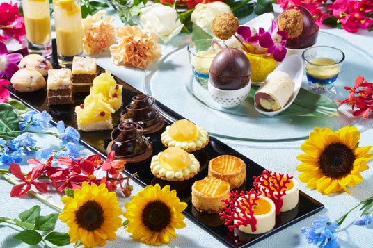 「トロピカルアフタヌーンティー」は、果実のフレッシュさとジューシーさを活かし、暑い季節にもすっきりと楽しめるラインアップが特徴です。夏の陽射しを思わせる「桃とエルダーフラワーのタルト~ひまわり仕立て~」や、爽やかな酸味が広がる「パッションフルーツとオレンジのムース」など、見た目にも華やかなスイーツを全8種類取り揃えました。セイボリーには、ジューシーなローストビーフとライム香る特製タルタルソースが絶妙に調和した「ローストビーフとライムのタルタル ラップサンド」など、全4種類をご用意。甘さと塩味のバランスが絶妙な構成で、最後まで飽きずにお楽しみいただけます。
