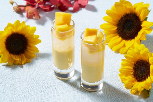 「パインのベイクドチーズケーキ」(※3)は、フルーティーなパイナップルの果肉をたっぷりと練り込み、軽やかな口当たりに仕上げたチーズケーキです。表面にはパインシートをあしらい、見た目にも涼しげなアクセントを添えました。ほどよい酸味とクリーミーな食感のコントラストを楽しめる一品です。また、「マンゴープリンとライチのジュレ」(※4)は、とろりと濃厚なマンゴープリンと、ほんのり甘く芳醇な香りのライチジュレを重ねた二層仕立ての一品です。なめらかなプリンと、つるんとしたジュレの食感が絶妙に調和し、優雅な味わいを演出します。マンゴーとライチの果肉を惜しみなく使用した、南国らしい爽快なフレーバーをお楽しみください。