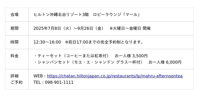 【2025年6月26日】ヒルトン沖縄北谷リゾート(北谷町(ちゃたんちょう)美浜(みはま) 統括総支配人 宍倉裕(ししくらゆたか))は、ロビーラウンジ「マール」にて、2025年7月8日(火)から9月26日(金)までの期間、夏のフルーツで彩る「トロピカルアフタヌーンティー」を提供いたします。爽やかなスイーツとセーボリーを堪能できる本フェアは、1日限定10名様でご案内いたします。