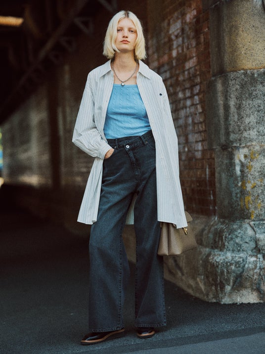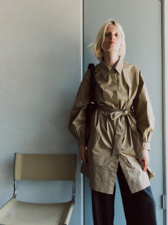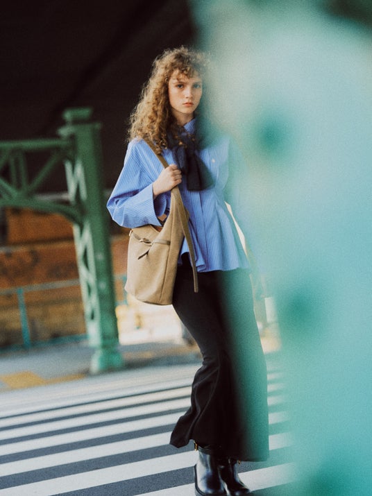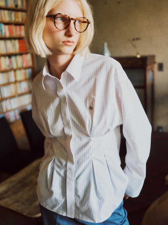 メンズライクなサイズ感にウエストタックを施し、自然にスタイルアップ。1枚で着ても重ね着でも楽しめるシャツ。
