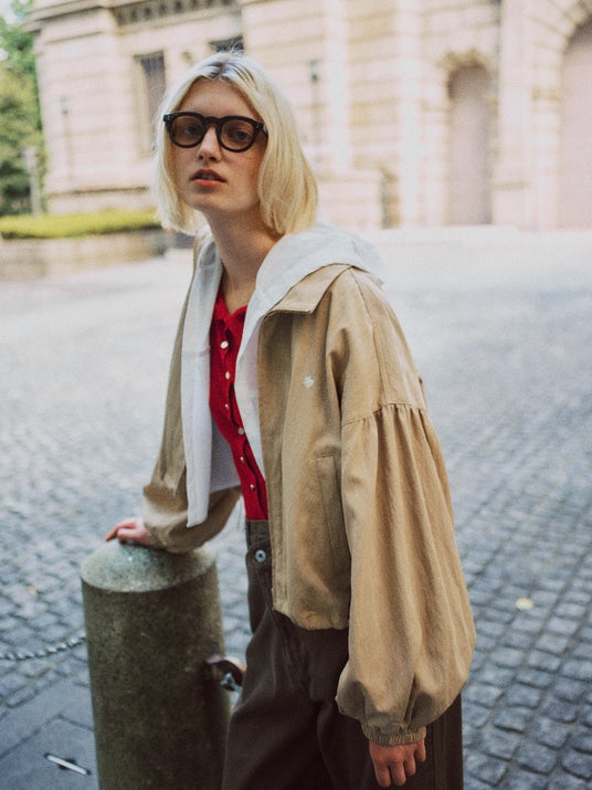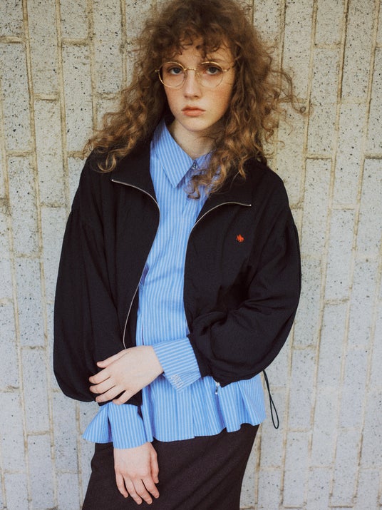 シャツ感覚のライト素材。スタンドネックと短め丈でデコルテを綺麗に見せ、女性らしく着られるブルゾン。