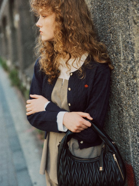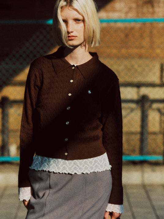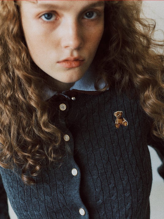 コンパクトなシルエットのケーブル編みニット。軽い羽織にもトップスにもなる万能アイテム。胸元の「POLO BCS」ロゴ刺繍がワンポイント。