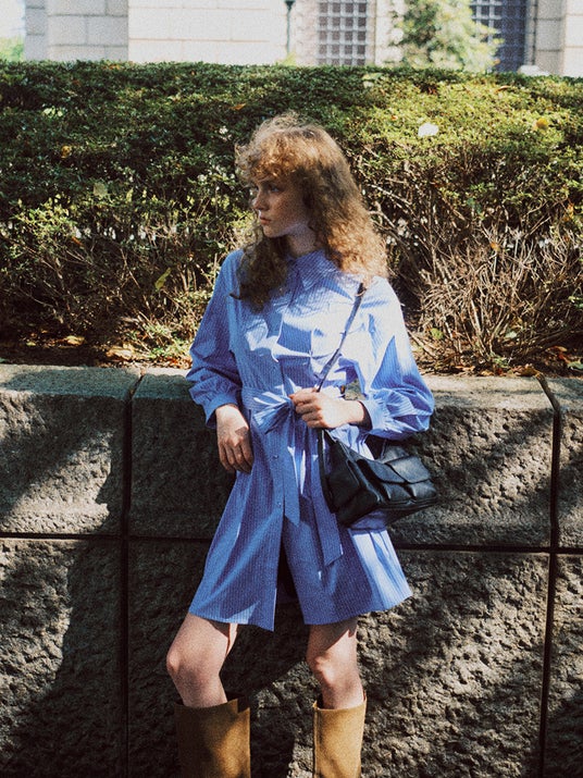 MINI丈シャツワンピース。共地ベルトでブラウジング可能。前開きなので羽織としても着用でき、秋のトラッドコーデに最適。