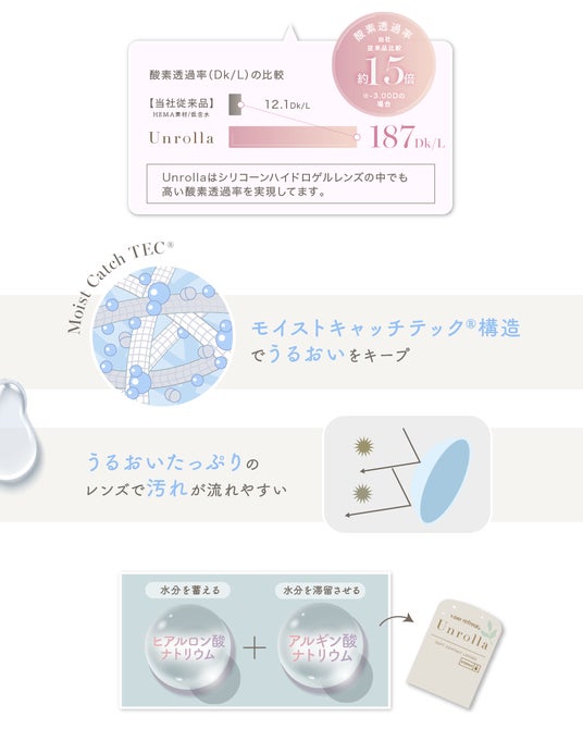 リフレアシリーズ待望の新作Unrollaは、日本初(※1)のシリコーンハイドロゲル素材の回らない水光カラコンです。
