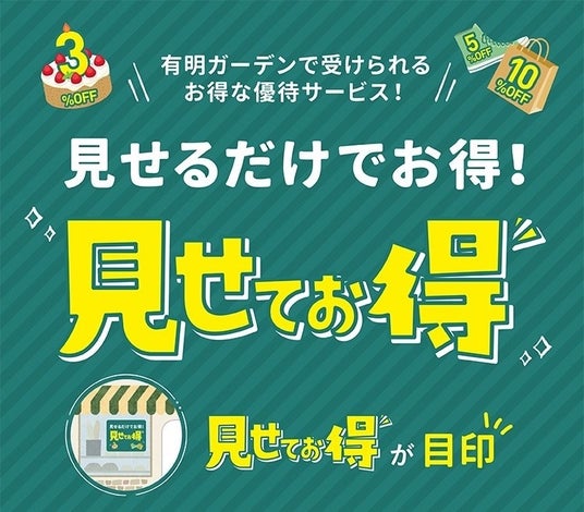 『見せてお得』は、複合商業施設「有明ガーデン」内の各施設をご利用の方が、モール店舗で割引やサービスを受けられる優待サービスです。チケットやレシートを見せるだけでご利用いただけるため、お近くにお住まいの方はもちろん、イベントや旅行で有明を訪れた方も、気軽にご利用いただけます。