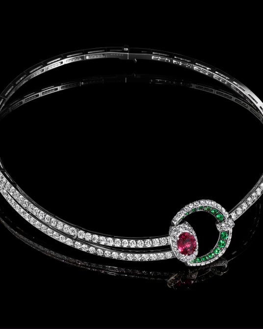 アシンメトリーなチョーカー風のフォルムに鮮やかなレッドとグリーンのカラーストーンを組み合わせたネックレスもあります。ホースビットには、3.07ctのオーバルカットのルビーとラウンドカットのツァボライトが輝き、その周りをダイヤモンドの煌めきが囲みます。さらにホースビット モチーフのイヤリングには、1.62ctのルビー 2石(片耳に1石ずつ)と、繊細なツァボライトとダイヤモンドがセットされ、ネックレスとお揃いの色彩で輝きます。