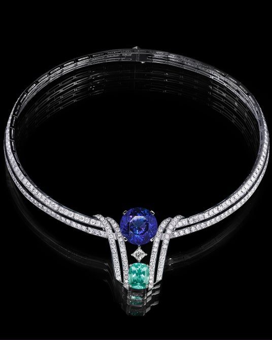 ラビリンティグッチの20点の新作のひとつは、直線状に連なるダイヤモンドが身につける人の動きに合わせて煌めきを放つネックレスです。ネックラインを包み込むようなしなやかなデザインの中央に、24.75ctのラウンドカットを施したタンザナイトの鮮やかなブルーと、5.94ctのクッションカットのパライバ トルマリンのラグーンを思わせるやわらかな色合いが、有機的な輝きを放ちます。2つのジェムストーンからダイヤモンドが流れ落ちるように配されたデザインは、庭園の奥にひっそりと存在する泉を思わせます。