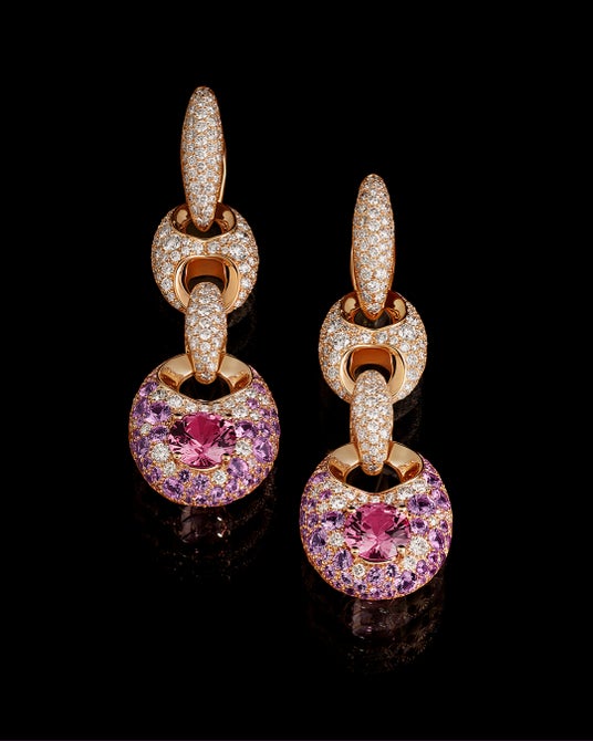 また、3.40ctのブラジル産アクアマリンを中心に、ライトブルー サファイアとダイヤモンドパヴェをあしらったマリナチェーン チャームをペンダントにしたネックレスもあります。同様のデザインのピンクゴールドのイヤリングでは、2.73ctのスピネルにピンク サファイアとダイヤモンドパヴェがロマンティックな輝きを添えます。さらにゴールドにタンザナイトとダイヤモンドを組み合わせたネックレスとイヤリングのセットもあります。