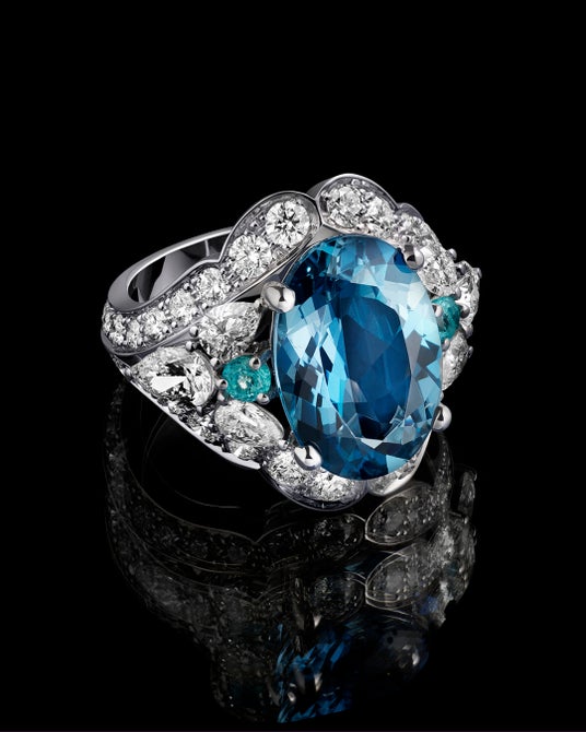 6.02ctの優美なオーバルカットのモザンビーク産アクアマリンを主役にしたリングは、バラの花びらを模したレースのように繊細でロマンティックなセッティングに彩られています。センターストーンを支えるリングアームには、2石のパライバ トルマリンとペアシェイプのダイヤモンドが花びらのようにあしらわれ、華やかな輝きを添えます。