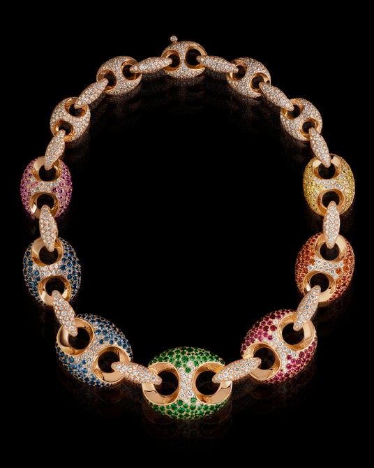 このコレクションを象徴するのは、レインボーカラーのネックレスとブレスレットのセット。マリナチェーンのチャームを何百石ものルビー、ツァボライト、そしてブルー、オレンジ、ピンク、イエローのサファイアが華やかな輝きで彩り、チャームを繋ぐリンクにはダイヤモンドのパヴェが繊細にきらめきます。