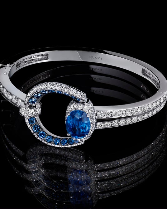 このコレクションを象徴するジュエリーのひとつは、シンプルなラインにダイヤモンドを散りばめたブレスレットで、ホースビットに施された5.19ctの大ぶりなオーバルカットのサファイアがプレシャスな輝きを放ちます。