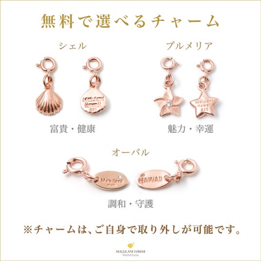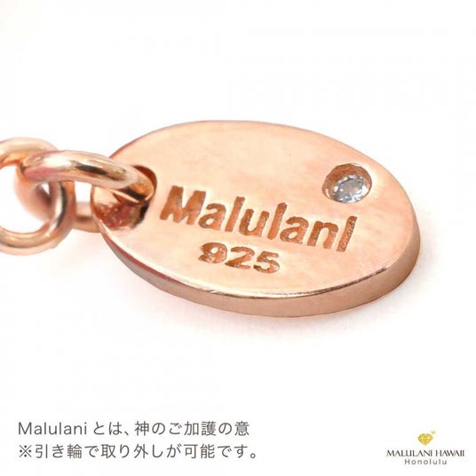 キラリと光るオリジナルチャームには、「神に護られた」という意味のハワイ語「Malulani」と刻印。