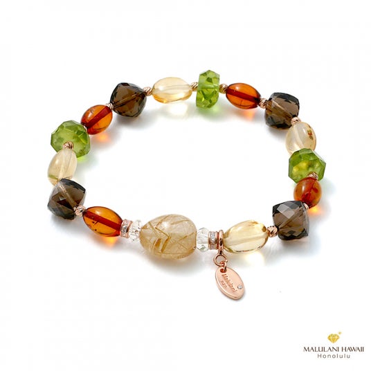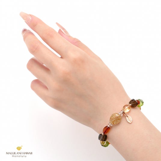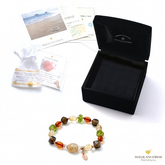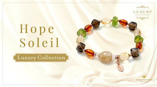 ハワイ発祥の天然石アクセサリーブランド「マルラニハワイ」より、太陽神を象徴する3種の石、アンバー、ペリドット、シトリンと、グラウンディングに最適なスモーキークォーツ、金運やチャンスを引き寄せるルチルクォーツで仕立てた、豊かさと成功をもたらすパワーストーンブレスレット「ホープソレイユ」が発売になりました。