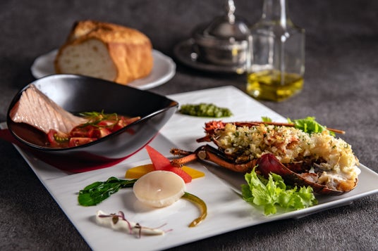 ( ノルウェーサーモンとホタテのミキュイ イセエビの香草オイル焼きと共に / 18,000円コースより )