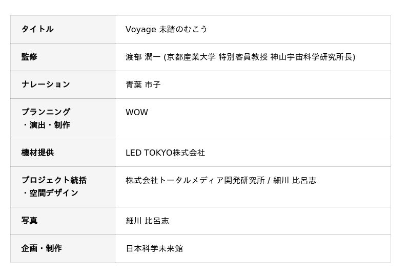 新設する「シアタールーム」で上映するのは、人類未踏の惑星探査をテーマにした作品「Voyage 未踏のむこう」。宇宙船の窓に見立てた大型曲面LEDパネルと鑑賞ステージエリアを設置した、音と映像のイマーシブ型体験空間で、太陽系を中心に星々を巡る大迫力の宇宙旅行を楽しむことができます。宇宙探査の歴史のなかで蓄積された科学データをもとに、太陽や火星の姿を高精細なCGで再構築。臨場感あふれる美しさと科学的な確かさを両立しました。また、渡部潤一さん(京都産業大学 特別客員教授 神山宇宙科学研究所長)監修のもと、探査機がまだ踏み込めていない木星の雲の中や、エウロパ(木星の衛星)の地上風景を映像化。科学的知見を手がかりに、未踏の宇宙を美しい映像体験へと拡張しています。さらに、音楽家 青葉市子さんのナレーションが全編を通して寄り添い、体験者を詩的な宇宙の旅へと誘います。
